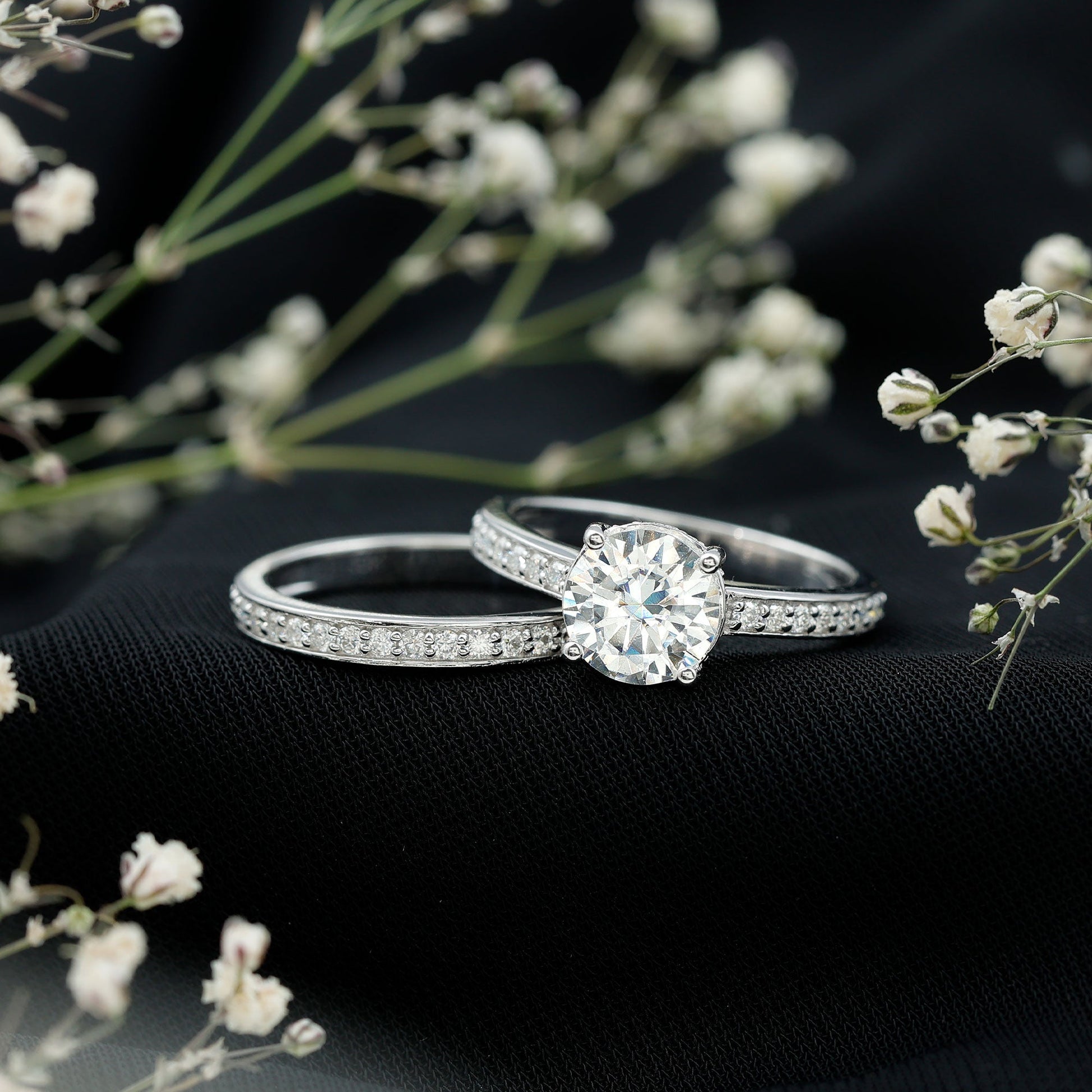 Celebrate your love with this exquisite Wedding Ring Set that features an 8 MM Round Shape Moissanite in Prong Setting with small Moissanite gemstones.