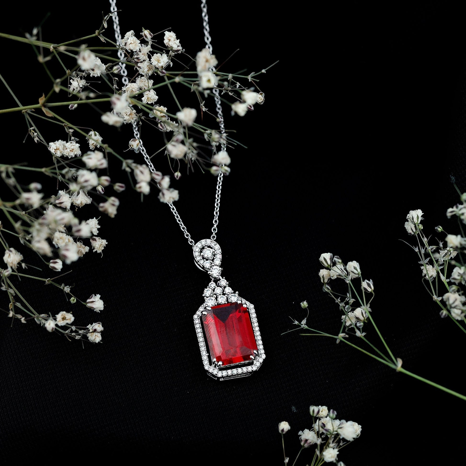 Make a statement that lasts forever with this stunning Art Deco Necklace. Made from white gold plated silver, this gorgeous Wedding Necklace for Bride showcases a 10X14 MM emerald cut lab-created ruby in a prong setting, radiating a color of love with mesmerizing brilliance. The center stone is surrounded by a delicate Halo of round brilliant cut Moissanite and features a cluster at the top, boosting its luxurious vibe. The Vintage Ruby Necklace hangs from a cable chain, perfectly combining timeless charm with modern luxury. The Art Deco allure of the Lab Grown Ruby Necklace is crafted to embody timeless elegance, merging style and sophistication. The classic Emerald Cut embraces a vintage art deco-inspired design with bold geometric shape, making it a luxurious yet subtle accessory for any event.