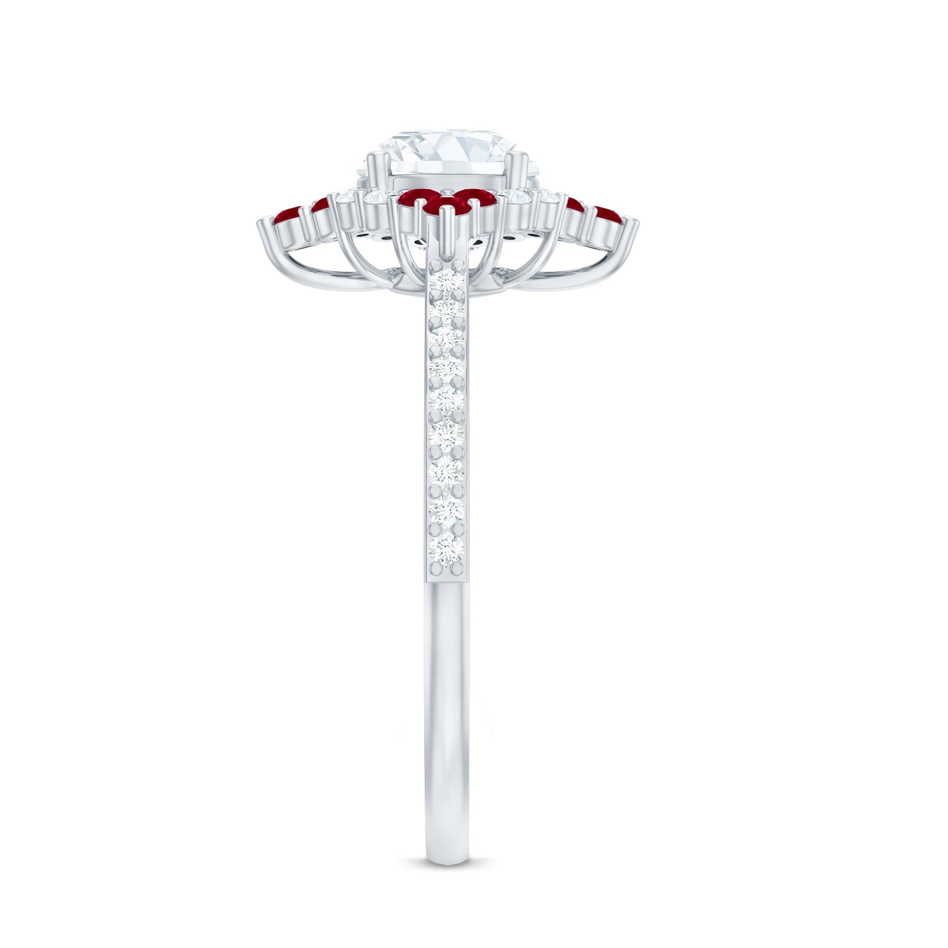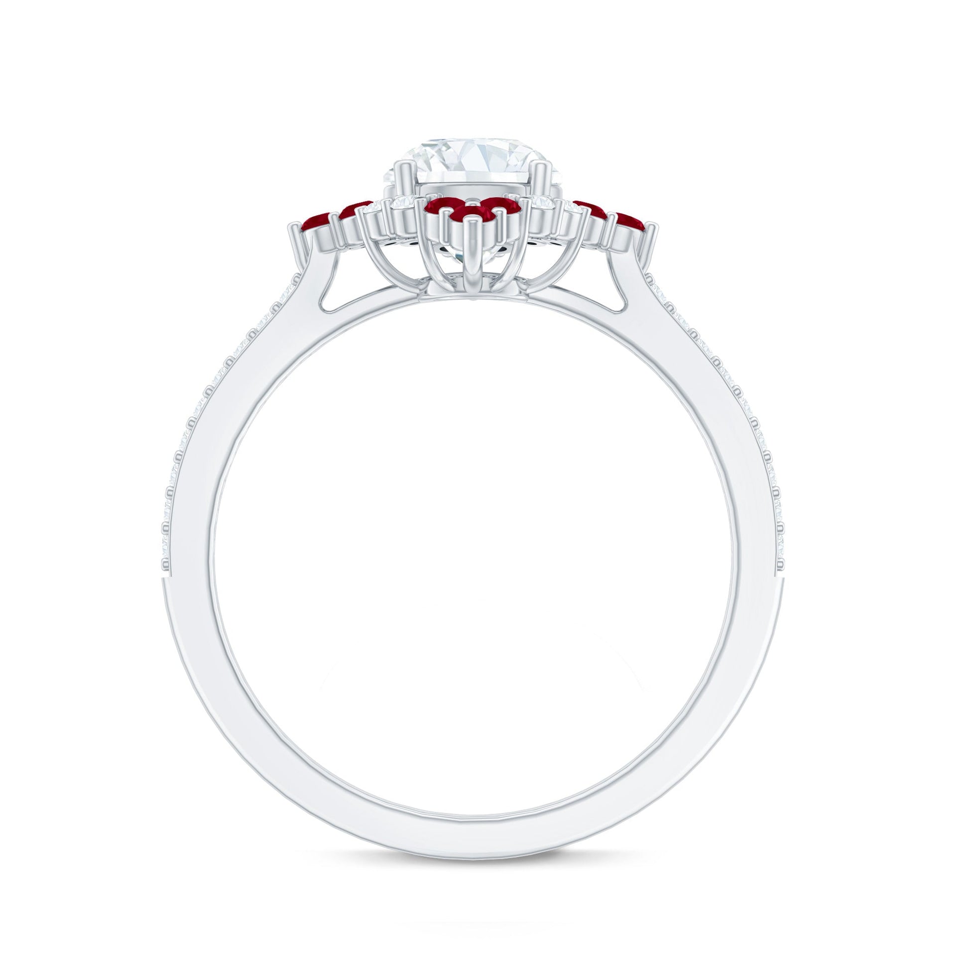 Your partner will love this Diamond Engagement Ring with Ruby that adds a pop of color to her unique style. This Halo Ring is embellished with a 6 MM Round cut Lab Grown Diamond set as the center stone in prong setting, surrounded with red ruby trios and small diamonds, making it an incredible choice. The band is also lined with synthetic diamonds to add a touch of extra brilliance. It is a classic piece of jewelry that speaks of timeless beauty and deep emotions, designed for her to make a statement. Our Cocktail Ring comes in a premium box that can later be used to store the jewelry when not in use also, available in various sizes and metal color options.
