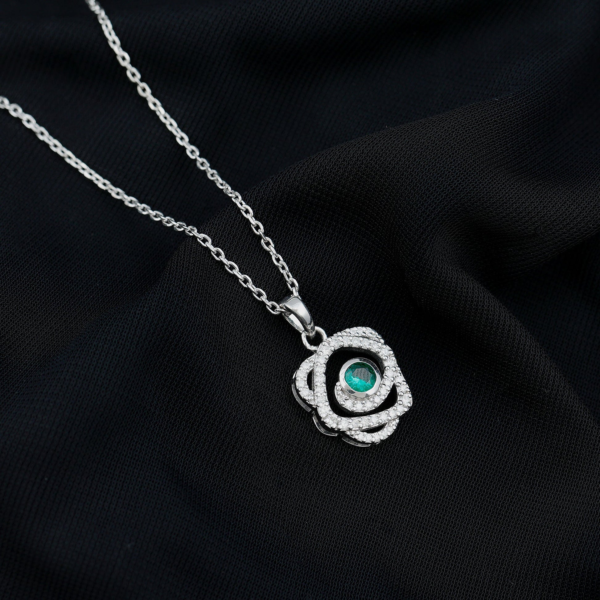 Discover the timeless charm of our Emerald Flower Pendant Necklace, made from stunning 14k white gold plated sterling silver. Embellished with sparkling moissanite stones and a vibrant emerald, this Floral Necklace is crafted to leave a lasting impression and elevate any outfit. The pendant showcases a graceful floral design, featuring a bezel set 4 MM round cut lab-created emerald at its center, surrounded by small moissanite gems set in a unique metal frame. With its subtle floral grace, this Emerald and Moissanite Necklace beautifully enhances your individual style. The deep green hue of the emerald radiates elegance and charm, making it the perfect accessory for any occasion. This Unique Emerald Necklace is suitable not only for everyday wear but also for cocktail parties as a stylish fashion statement, as a thoughtful gift for birthdays, anniversaries, or Valentines Day to someone special, or even worn on your wedding day for a stunning contrast. Elegant, timeless, and unforgettable - this Flower Locket Necklace is designed for those who want to shine in their own unique way. Treat yourself or a loved one to this truly exceptional piece of jewelry.