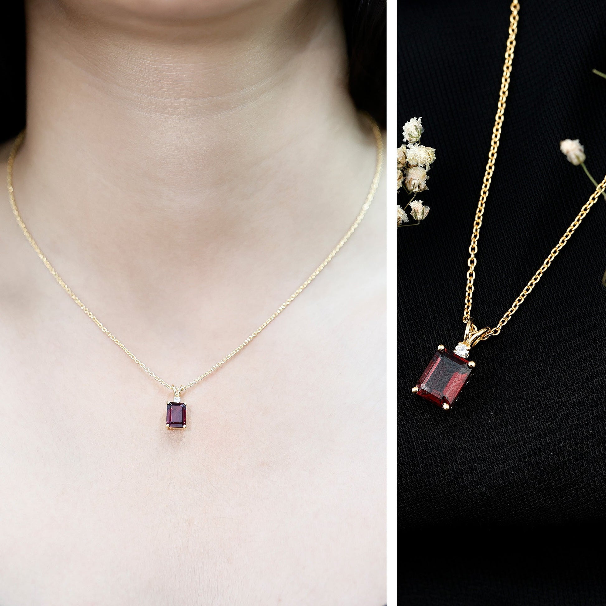 Turn heads with the rich, romantic hue of this Rhodolite Garnet Necklace, a striking blend of bold color and timeless elegance. Crafted from sterling silver with a 14k yellow gold plating, this Solitaire Pendant features a captivating 6X8 MM emerald cut Rhodolite gemstone set in prongs, radiating a luxurious hue that symbolizes passion, love, and inner strength. Adding a delicate contrast to the intense beauty of the center stone is a sparkling dainty round brilliant cut lab diamond, enhancing the pendant’s brilliance without overshadowing the star of the show. The refined combination of rich color and fiery sparkle makes this Emerald Cut Necklace a standout piece that is anything but ordinary. Suspended gracefully from a shimmering chain with a rabbit ear bail, this Rhodolite Pendant is designed to complement everything from evening wear to wedding gowns, or even elevate your everyday look. This Rhodolite and Diamond Necklace makes a thoughtful gift for anniversaries, birthdays, Valentine’s Day, or simply celebrating someone who loves rich, vibrant color. It is not just a piece of jewelry, it is a celebration of confidence, romance, and unforgettable style. Let your neckline glow with the warmth and sophistication of this stunning gemstone treasure.