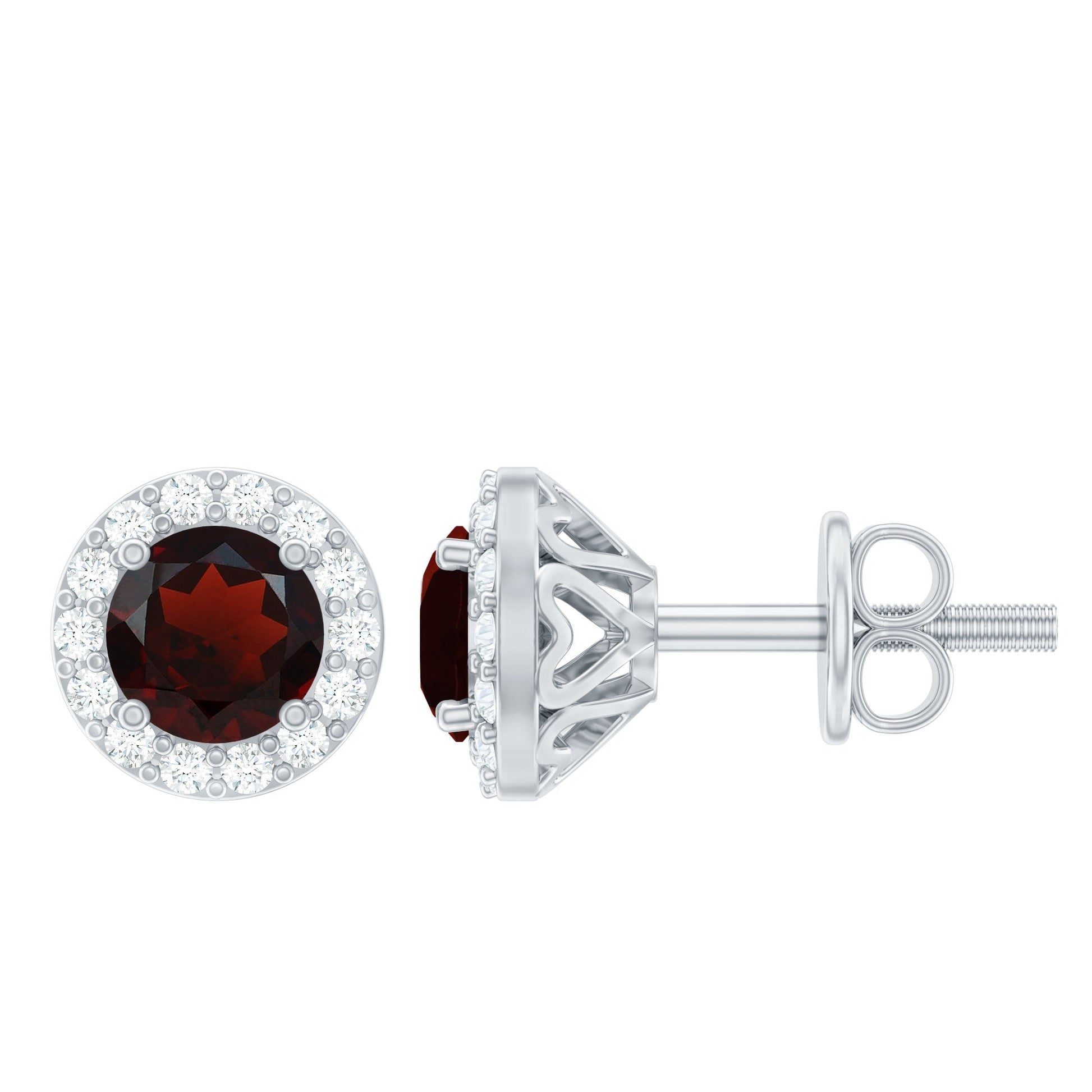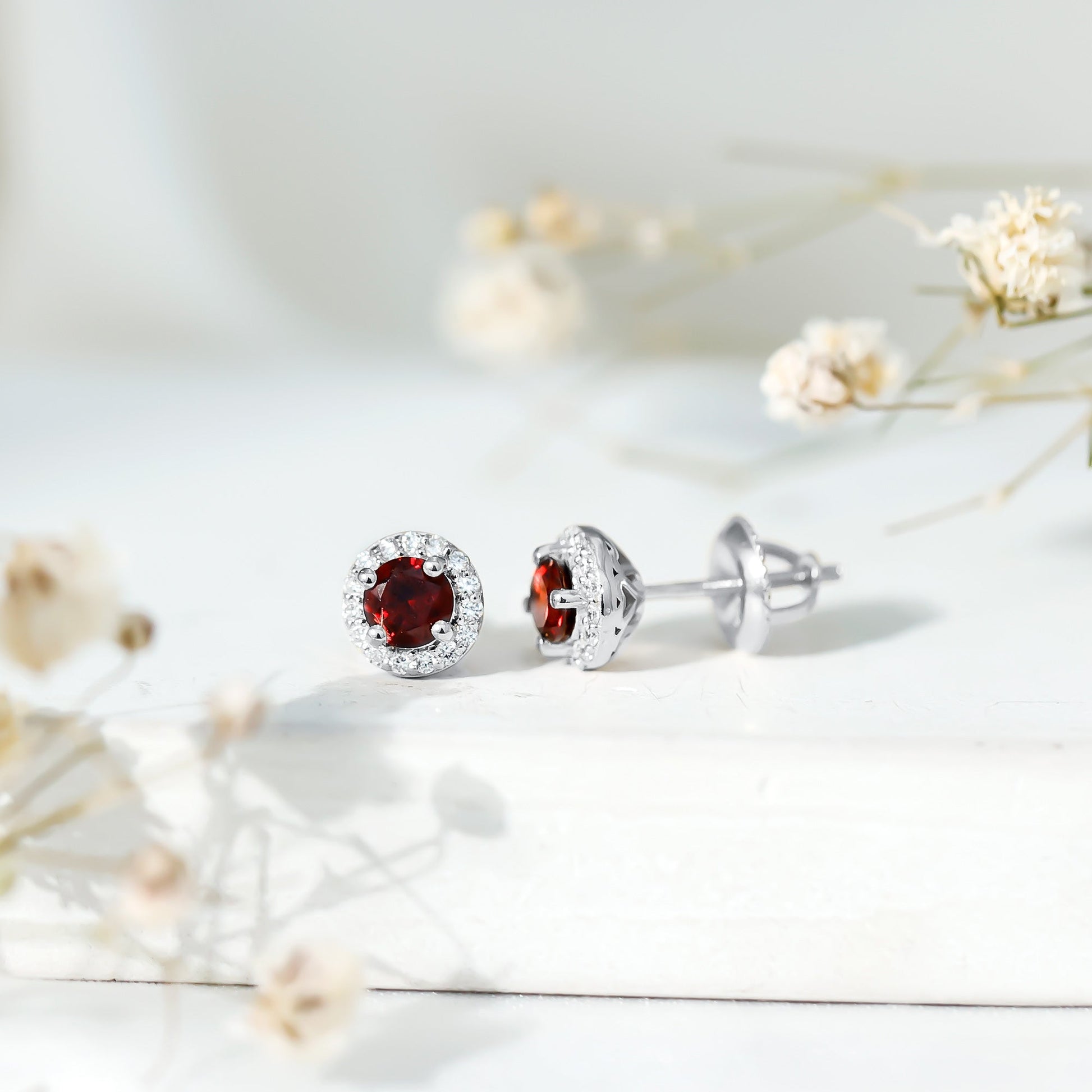 Add a bold yet timeless touch to your collection with these stunning Garnet Stud Earrings. Designed in white gold plated silver, these Halo Stud Earrings bring together classic beauty and modern charm in a way that is perfect for both special occasions and everyday wear. At the center of each earring is a 4 MM round cut garnet, securely held in prong setting. Surrounding each garnet is a shimmering halo of brilliant lab grown diamonds, carefully set to enhance the overall sparkle and create a lovely contrast with the center stone. These Garnet and Diamond Earrings are finished with secure screw back closures, offering both comfort and peace of mind, especially for daily wear. Whether you are dressing up for a formal evening or adding a refined accent to your casual outfits, these Garnet Earrings are a perfect match. They make a thoughtful gift too, especially for anniversaries, romantic milestones, or anyone who loves deep, rich gemstones paired with elegant sparkle. Striking, meaningful, and designed to last, these round studs are a beautiful expression of confidence and grace, wrapped into one exquisite pair.