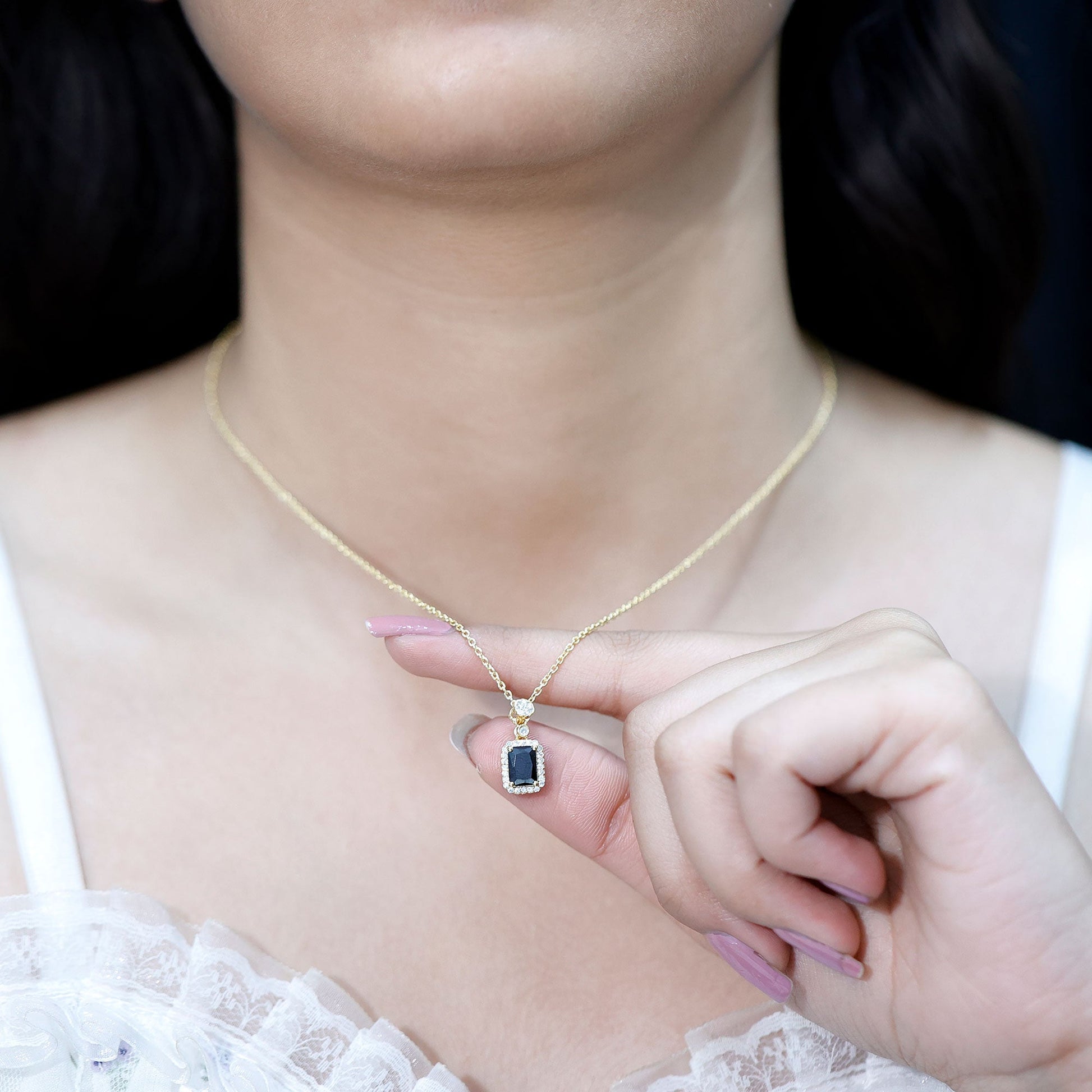 Add a touch of mystery and old-world to your look with this stunning Black Diamond Necklace, a perfect blend of modern charm and timeless beauty. Handcrafted in yellow gold plated silver, this Statement Necklace features a bold 5X7 MM emerald cut lab created black diamond held in a secure prong setting. Surrounding it is a halo of sparkling round lab grown white diamonds, adding just the right amount of brilliance to balance the deep black center stone. What makes this Black and White Necklace even more special is its delicate flower design, beautifully adorned with more round lab grown diamonds and a petite diamond in the center for an extra hint of sparkle. Dangling gracefully from a matching chain, this Emerald Cut Black Diamond Necklace is perfect for both everyday elegance and special occasions. The stones are not only beautiful but also ethical and eco-friendly, created in a lab using sustainable methods that reduce the environmental impact of traditional mining. Whether you are dressing up or just want to feel a little more confident, this Vintage Necklace for Women is a statement piece that tells your story. With its Art Deco-inspired design and vintage flair, it is perfect for someone who loves modern style with a classic twist.