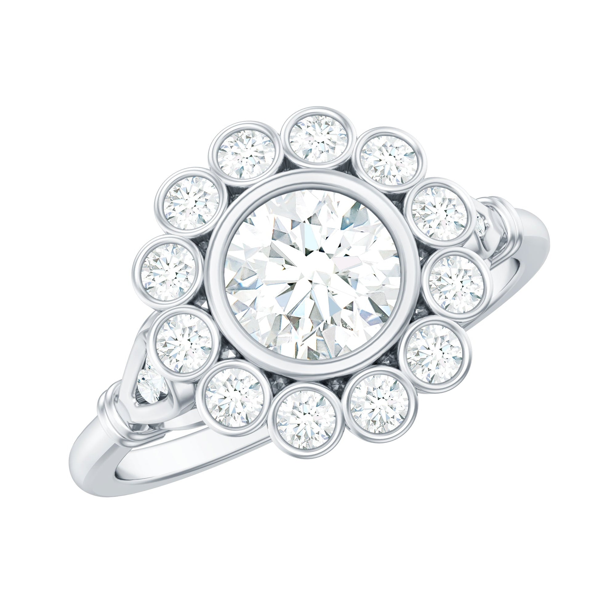 Here is your everlasting sparkle, designed to capture both the spotlight and hearts. This Lab Grown Diamond Halo Ring is truly a dream come true in any jewelry collection, made for those who appreciate classic elegance with a contemporary flair. Featuring an EF-VS Quality 6 MM round lab grown diamond in bezel setting that shines brilliantly from every angle, the surrounding halo enhances its radiance. The vintage-inspired designs beneath the main stone and the additional stones along the band bring a touch of grace and timeless charm to the overall look. This Lab Created Engagement Ring is ideal to mark a sweet promise, a significant milestone, and serves as a daily reminder of love that deepens with each passing day. Whether you are planning a proposal, celebrating a special occasion, or simply treating yourself, this Statement Diamond Ring for Women is perfect for all your cherished moments. This Round Diamond Engagement Ring is available in a variety of sizes, ensuring you find the perfect fit.