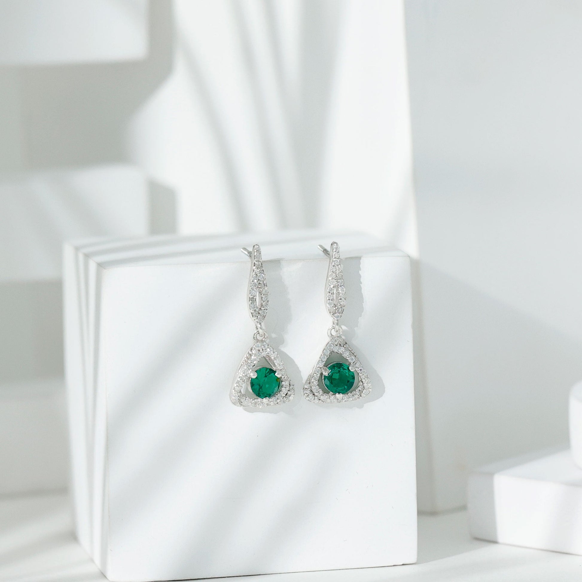 You are sure to be completely captivated by these Lab Created Emerald Drop Earrings, which truly exemplify stunning beauty and a unique design. Crafted with only the highest quality materials, this piece showcases beautiful prong set stones skillfully placed in 14k white gold plated silver. Enhancing the breathtaking design are the AAAA quality lab created emeralds that create a striking contrast with the D color, VS1 clarity moissanite stones. Our unique Dangle Drop Earrings feature a 6 MM round cut emerald at the center of an interlocked triangle frame embellished with round cut moissanite stones. Perfectly engineered in lab, their secure screw back closures beautifully complement the elegant flow of their design. They are guaranteed to stay in place when fastened correctly, whether you are dancing the night away, enjoying the activities, or simply stealing the show at a gathering. These Emerald and Moissanite Earrings will bring a touch of elegance to any outfit, making it a perfect choice for gifts, everyday wear, or special events.