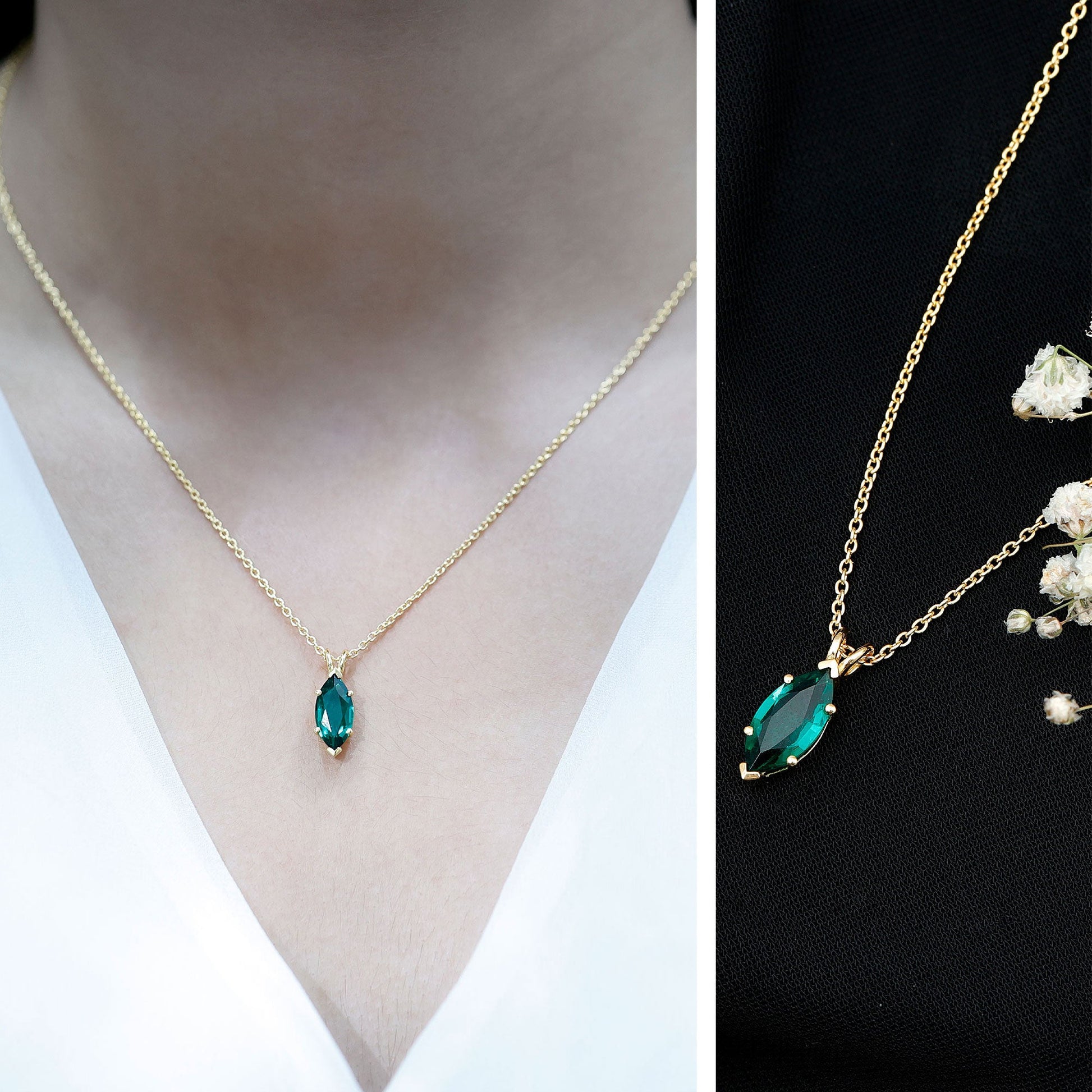 Sleek, stunning, and designed to impress, this Solitaire Emerald Necklace is your go-to for everyday elegance. It showcases a 6X12 MM Marquise Cut Lab Created Emerald that beautifully captures the light and is secured in prong setting. This Marquise Necklace is handcrafted in 14k yellow gold plated silver, perfectly blends classic charm with modern sophistication, making it an ideal gift for your loved one. Whether you are dressing up for a special event or just want to add a touch of luxury to your daily outfit, this Green Emerald Necklace will definitely make a statement. Hanging from a delicate chain with a cute rabbit ear bail and beautifully packaged in a lovely jewelry box, it is all set to be gifted. Whether you are planning to surprise your partner, celebrate self-love, or give your best friend a pop of color, this Solitaire Pendant Necklace is just right for any occasion. This May Birthstone Necklace is the kind of jewelry that brings a smile every time you wear it. It is the type that attracts compliments from strangers and makes you feel a little more radiant.