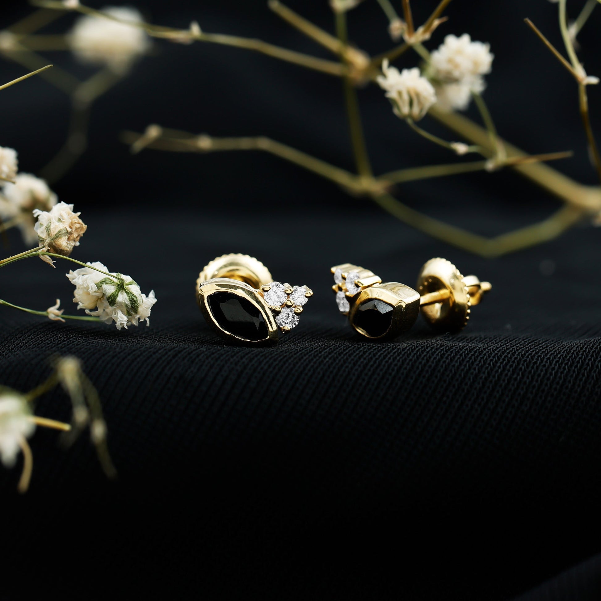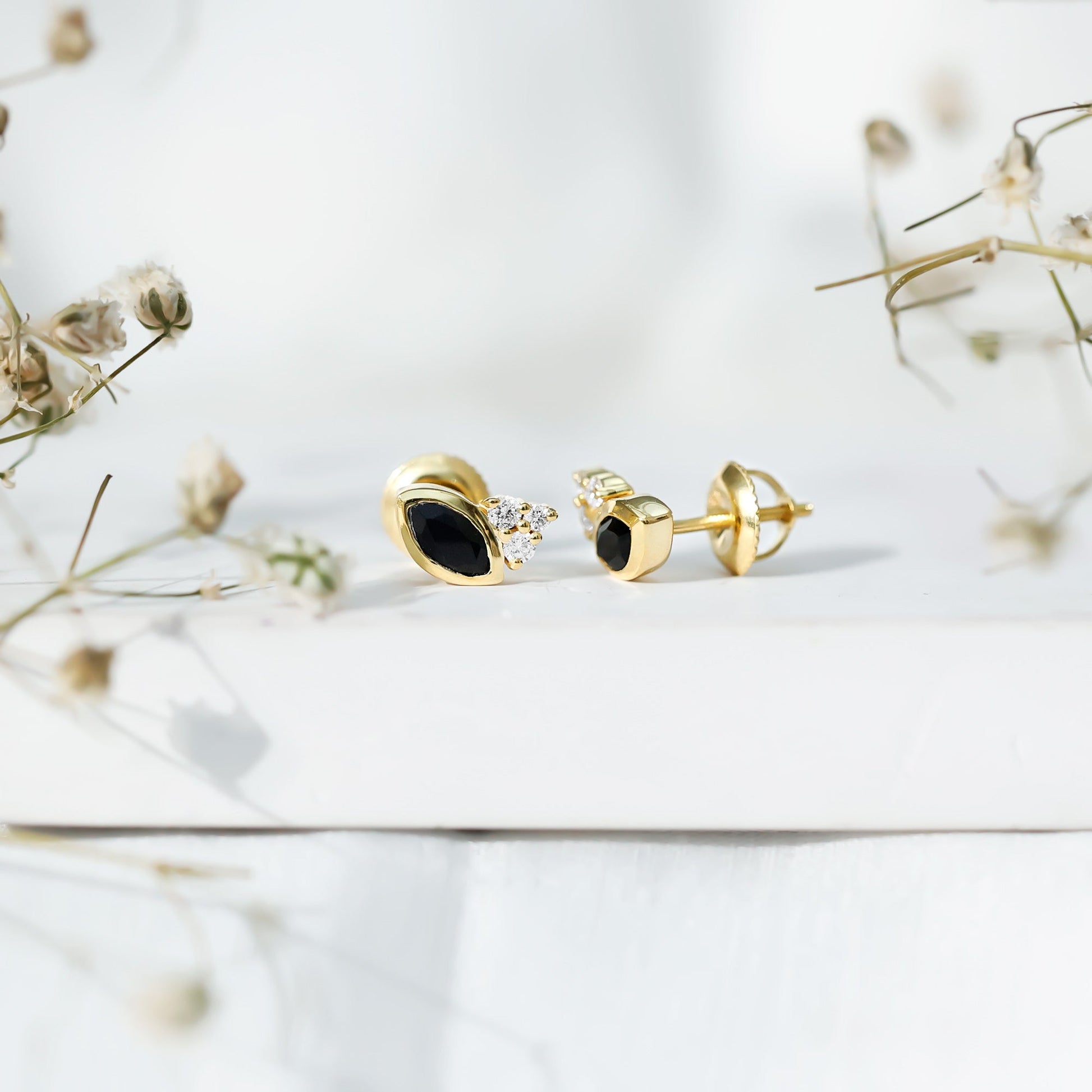 Grace your ear with these bold and beautiful Black Diamond Stud Earrings. Crafted in yellow gold plated silver, these Solitaire Earrings feature a sleek 3X6 MM marquise cut lab created black diamond set in bezel setting. On one side of the earring, a trio of round lab grown white diamonds sparkle with soft brilliance, adding a bit of contrast and elegance. Lightweight and easy to wear, the Black and White Diamond Earrings come with a screw back closure to keep them secure and comfortable throughout the day. Whether you are heading to work, meeting friends, or dressing up for something special, these Marquise Earrings are a great choice for adding something meaningful to your outfit. Made with AAAA quality lab grown black diamonds and EF-VS quality lab created white diamond stones, they are not just stylish, they are also ethical and sustainable. It is a smart choice for those who care about what they wear and how it is made. Modern, thoughtful, and full of personality, these Black Diamond Earrings are for the days you want to keep it simple, but never boring.