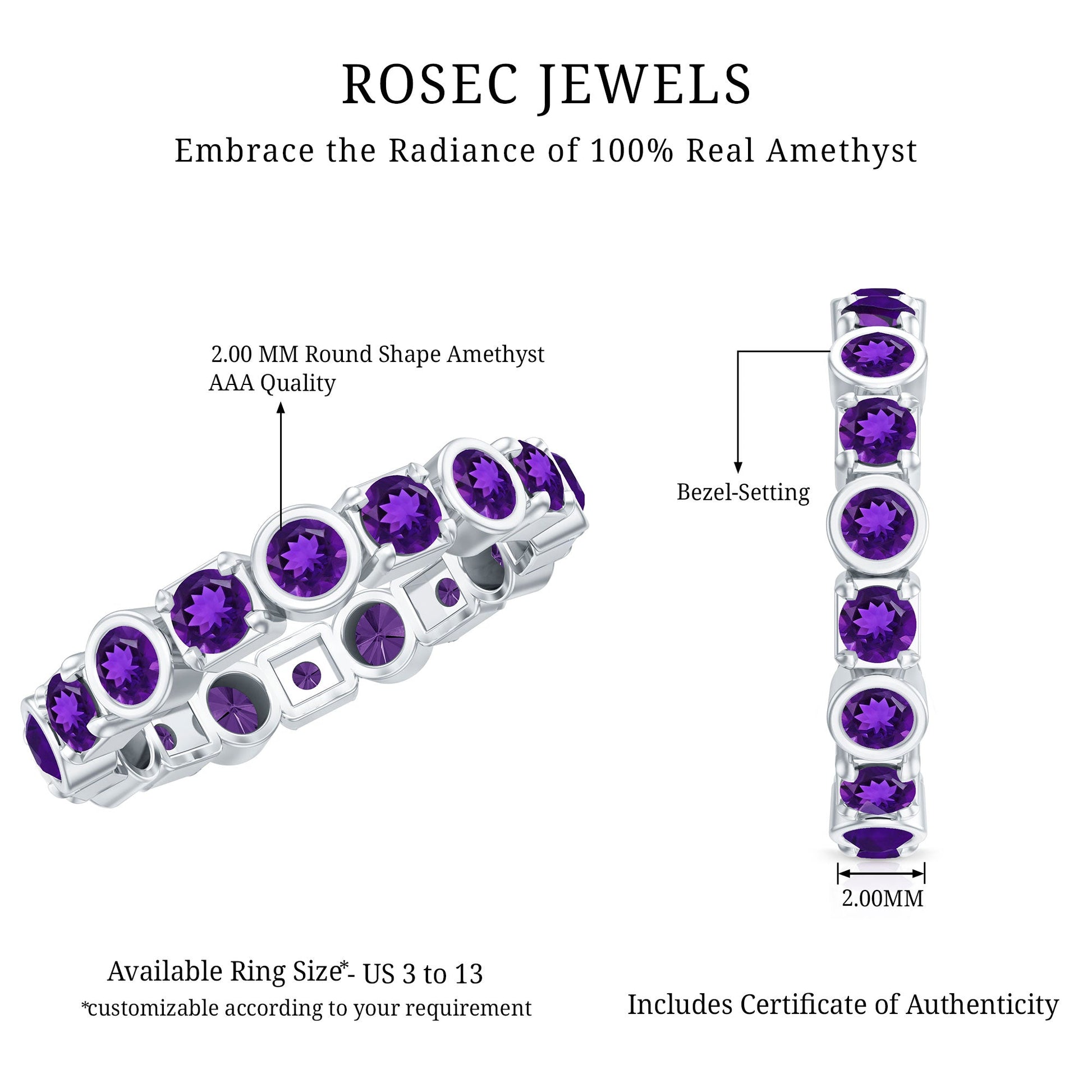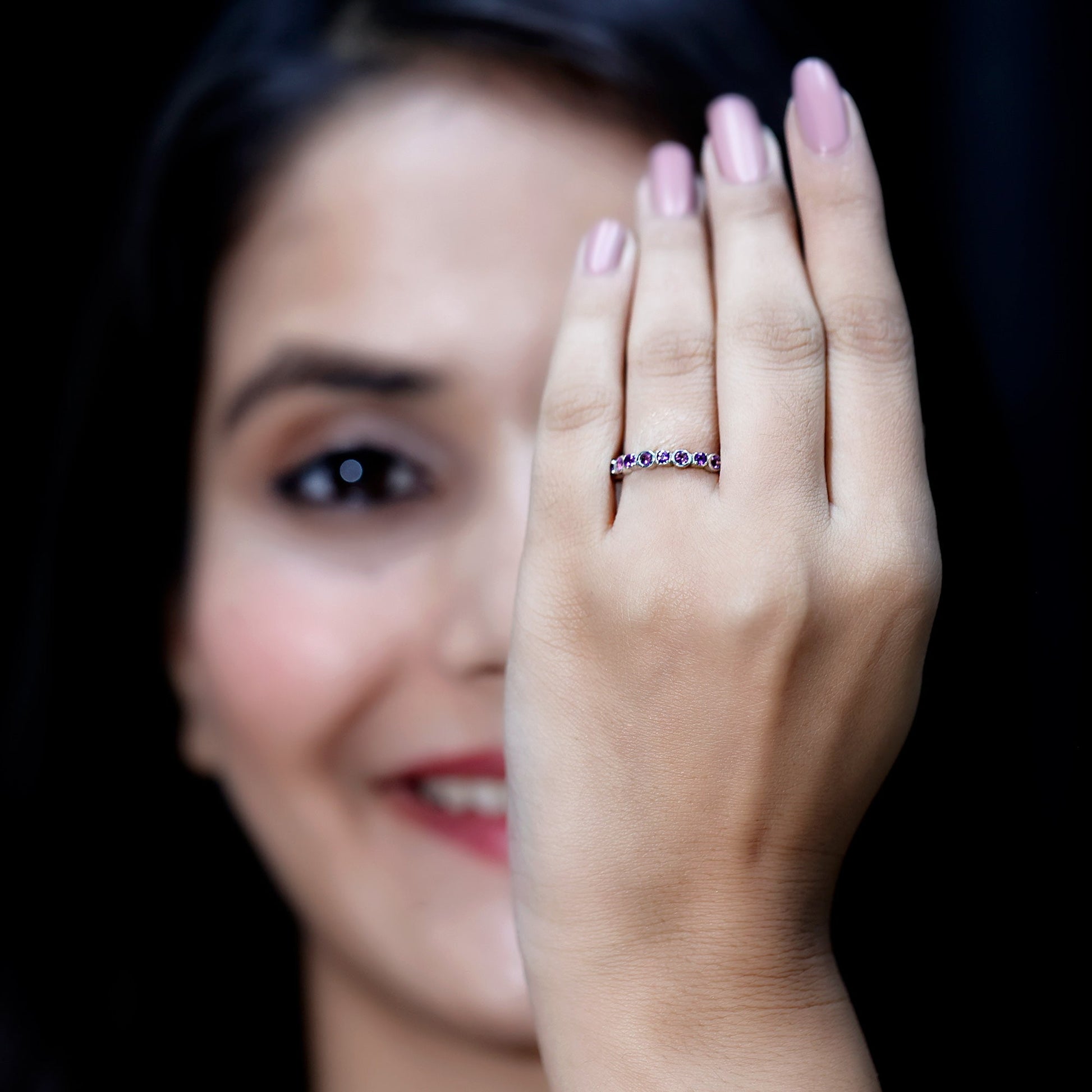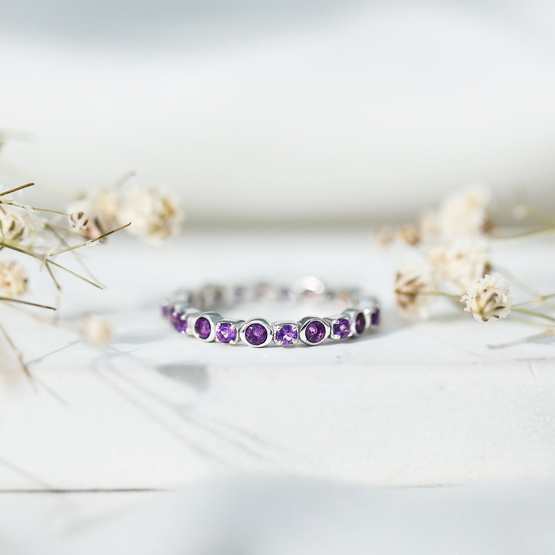 Designed to capture both elegance and meaning, this Amethyst Eternity Band is a beautiful way to mark the moments that matter. Crafted in 14K white gold plated silver, the ring features a continuous circle of carefully arranged round cut amethysts that go all the way around the band, symbolizing love and commitment that has no end. The full eternity style offers a statement look while still feeling smooth and easy to wear every day. Whether you are marking an anniversary, celebrating a February birthday, or adding to a growing stack of meaningful rings, this Amethyst Wedding Band stands out for its charm and versatility. It can be worn solo for a classic touch, or stacked with other rings to create your own unique look. The vivid purple of AAA quality amethyst gives it a rich feel, while the uniform design keeps it modern and minimal. This Amethyst Stackable Ring is a reminder of lasting love, strength, and inner clarity. It arrives ready to gift in an elegant box, making this Wedding Anniversary Ring perfect for celebrating someone special.