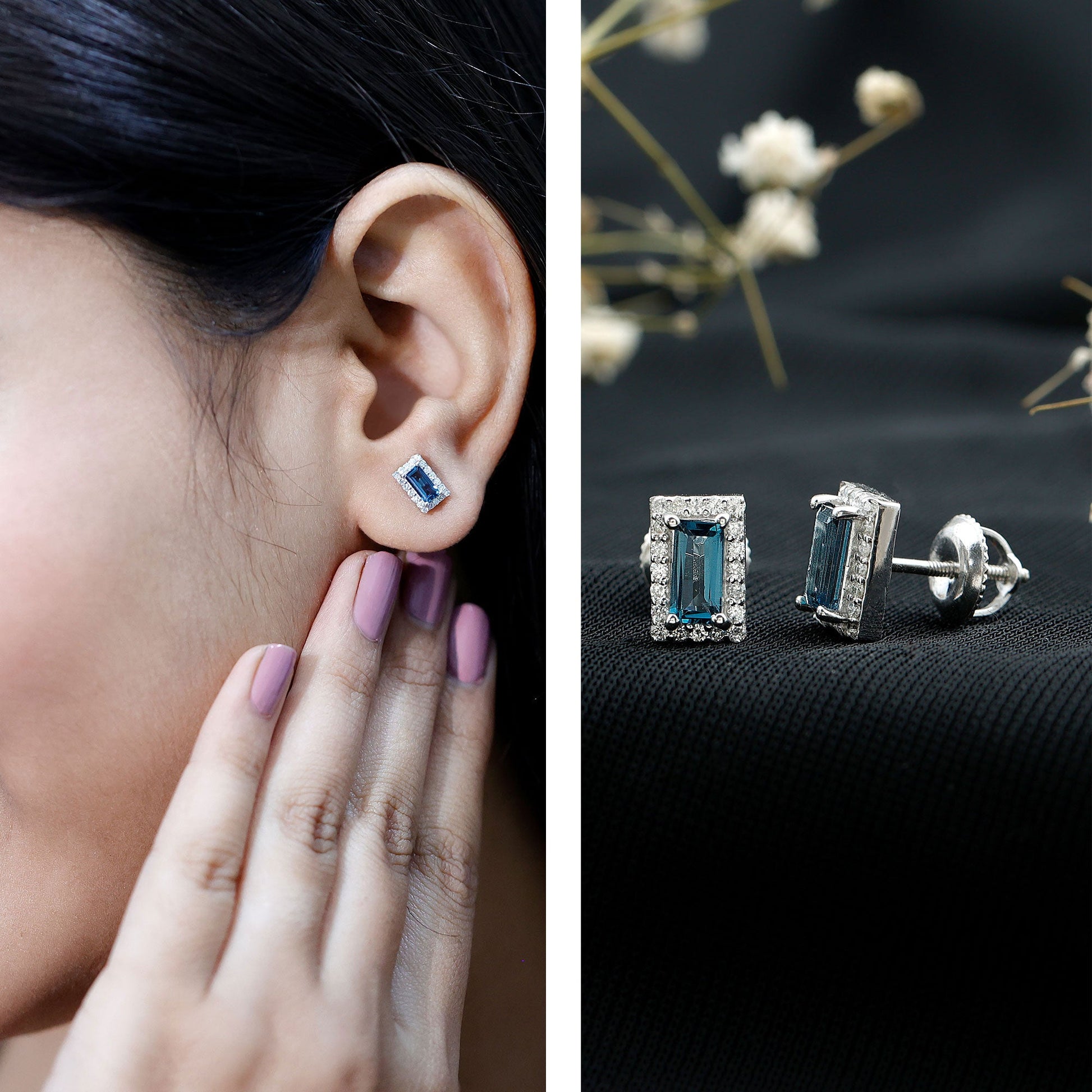 Step into elegance with these London Blue Topaz Earrings. Each earring showcases a stunning 3X6 mm Baguette Shape London Blue Topaz, known for its deep, ocean-like blue that captures light in the most mesmerizing way. Surrounding the Blue Topaz is a delicate halo of tiny sparkling Lab Grown Diamond stones of EF-VS Quality, adding extra brilliance and a touch of luxury to the design. Crafted with Sterling Silver, these Blue Topaz Diamond Earrings have a cool shine that perfectly complements the rich blue of the topaz. Packaged in an elegant box, these AAA Quality Blue Topaz Earrings are ready to bring a touch of sophistication and charm to any outfit. The Screw Back Closure keeps them secure, so you can wear them confidently throughout your day, whether you are at work, a party, or a special event. These Baguette Stud Earrings are a statement of refined style. The Baguette Shape gives them a modern look, while the Halo adds a classic sparkle, creating a beautiful balance between contemporary and timeless. Perfect for anyone who loves a pop of color mixed with subtle sparkle, they make a thoughtful gift or a stunning treat for yourself.