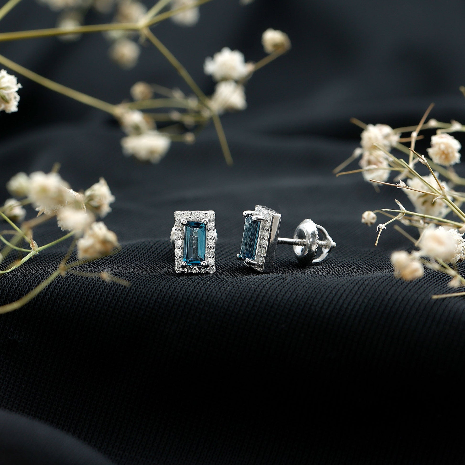 Natural Baguette London Blue Topaz Diamond Halo Stud Earrings