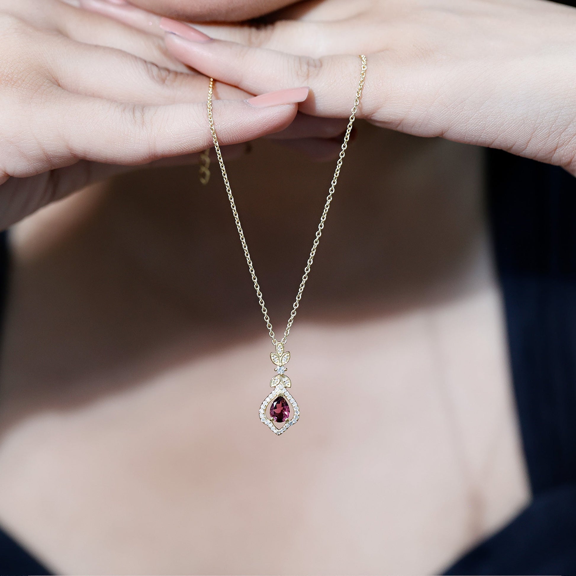 Elegant, radiant, and unapologetically romantic, this Pink Tourmaline Necklace is a breathtaking statement piece crafted with timeless beauty in mind. Handcrafted in 14k yellow gold plated silver, the Teardrop Pendant showcases a captivating 5X7 MM pear shaped Pink Tourmaline as its centerpiece, set in secure prong setting. Surrounding the center stone is a shimmering arrangement of round lab grown diamonds, creating a classic teardrop shape that glows from every angle. The intricate design flows upward with a graceful, nature-inspired motif, featuring diamond studded leaf-like shapes, which add texture, femininity, and symbolic elegance to the overall piece. Suspended from a sleek, adjustable chain and fastened with a lobster clasp, this Bridal Necklace for Wedding offers flexibility in length and ensures a secure and comfortable fit throughout your big day and beyond. Designed for the bride who wants to make a statement, this Pink Tourmaline and Diamond Necklace is the epitome of sophistication and sentiment. A stunning wedding day heirloom and a meaningful piece to cherish forever, it is perfect for anniversaries, festive occasions, and every unforgettable moment in between.